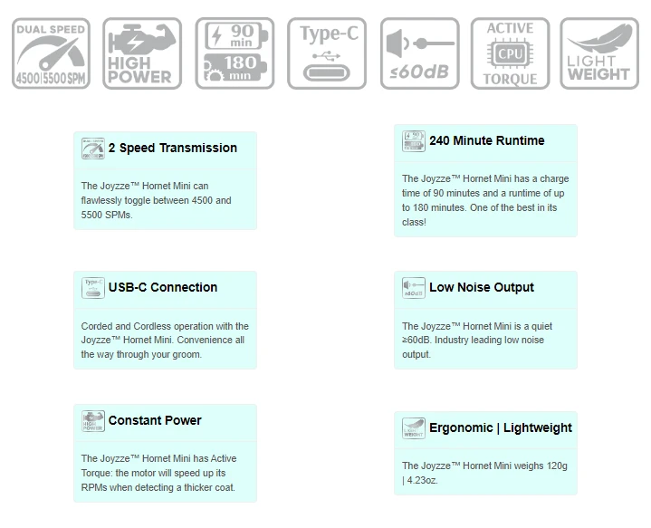 Joyzze Hornet Mini Trimmer is designed for professionals or home user for fine and precision cutting, perfect for pads, paws, face, ear as well as surgical prep work, can work through hard-to-reach spots and offers speedy performance in a compact light weight machine.