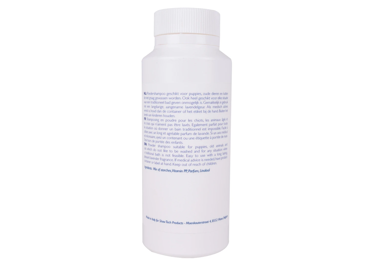 - Powder shampoo suitable for puppies, old animals and cats which do not like to be washed and for any situation when a traditional bath is not feasible.